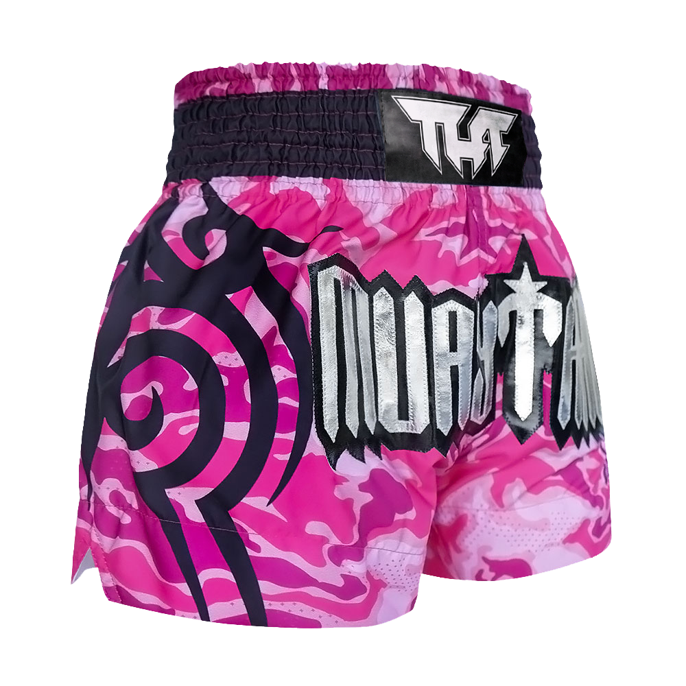 Inspired by Military camouflage, the use of camouflage by an armed force is to protect themselves from enemies. The primary function of camouflage is to deceive the human eye. Some of the earliest usage of camouflage patterns on military uniforms was commonly seen during World War II. Throwing pink into the mix makes the shorts become sweeter and more feminine. The shorts are made with outstanding hand-made quality and sublimation printing technology. Features a hand-stitched embroidered "Muay Thai" PU.